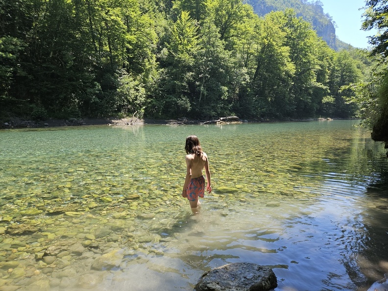 Le lendemain on profite de nouveau de la rivière Tara, toujours aussi froide, franchement c'est impossible de rester plus de 3 minutes dedans malgré la température infernale qu'il fait au soleil. Mais l'eau est de toute beauté, nous sommes seuls au monde (car oui ensuite ce sera de nouveau un défilé de barques en plastique emplies de gens portant des casques et des gilets). C'est tellement beau que les mots me manquent, je mets des photos à la place.
