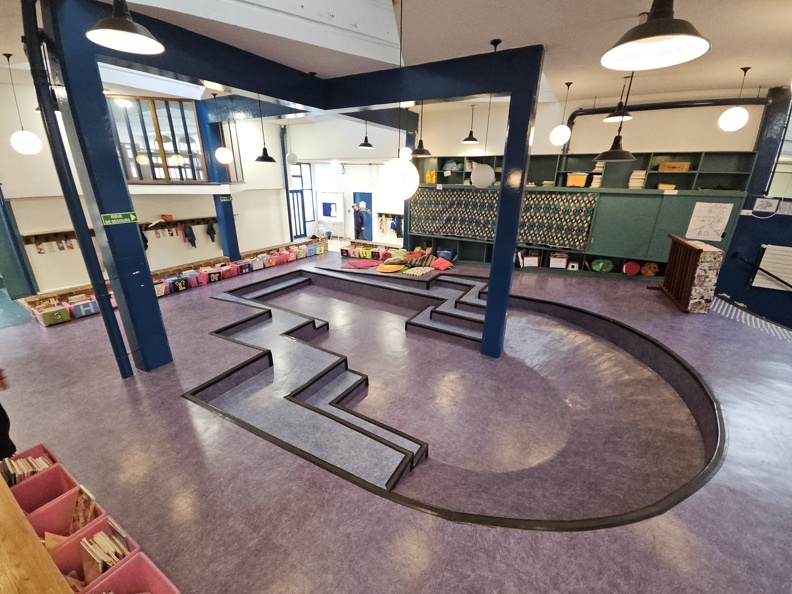 On a une grande cour pour jouer au ballon en hurlant, un classique de toutes les primaires, et de l'autre côté on accède à un dédale d'allées qui serpentent entre les étoiles vitrées qu'on voyait d'en bas tout à l'heure, avec moult cachettes et escaliers qui multiplient les points de vue et pourraient continuer à l'infini.