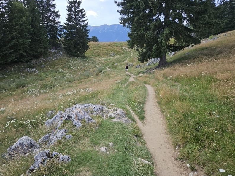Et nous avons bien fait -de monter- car nous avons atteint la limite des alpages, profité de jolis paysages avant de redescendre doucement vers la vallée. Enfin, doucement au début puis de nouveau dans une pente épouvantablement pentue et glissante nos genoux en ont pris un petit coup. Comme nous n'avons pas utilisé de sifflet nous avons eu le plaisir de croiser des chamois dans le sous-bois (drôle d'endroit pour des chamois mais on ne crache pas dessus, au moins cet animal ne risque pas de nous boulotter).